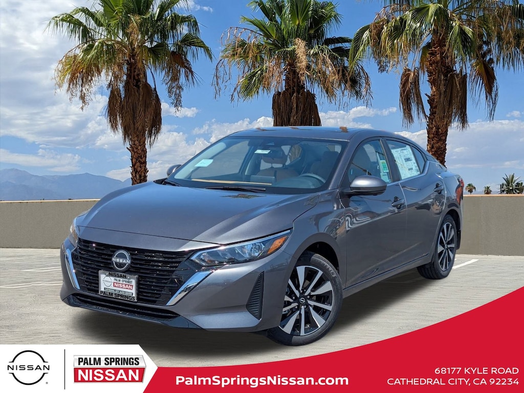 At Palm Springs Nissan, we proudly serve drivers in Cathedral City, Palm Springs, Indio, and the entire Coachella Valley with an unbeatable selection of new Nissan vehicles, certified pre-owned models, and quality used cars. Conveniently located in the heart of Southern California, our dealership is committed to delivering exceptional customer service, transparent pricing, and reliable automotive solutions that make every visit stress-free. Whether youâre shopping for the latest Nissan Rogue, Altima, Sentra, Frontier, or Pathfinder, or need trusted service and maintenance, Palm Springs Nissan is your one-stop destination. Our factory-trained technicians, state-of-the-art service center, and genuine Nissan parts ensure your vehicle runs at peak performance for years to come. Backed by a team that values honesty, integrity, and community engagement, Palm Springs Nissan is more than just a dealershipâ"weâre your automotive partner for every mile ahead. Gun Metallic 2025 Nissan Sentra SV Dealer Discount of $2,119 off MSRP FWD CVT with Xtronic 2.0L I4 DOHC CVT with Xtronic, Charcoal Cloth, All-Weather Package, Dual Zone Auto Climate Control, Heated Exterior Mirrors, Heated Front Seats, Hide-A-Way Trunk Net, Leather-Wrapped Heated Steering Wheel, Remote Engine Start, Trunk Package.